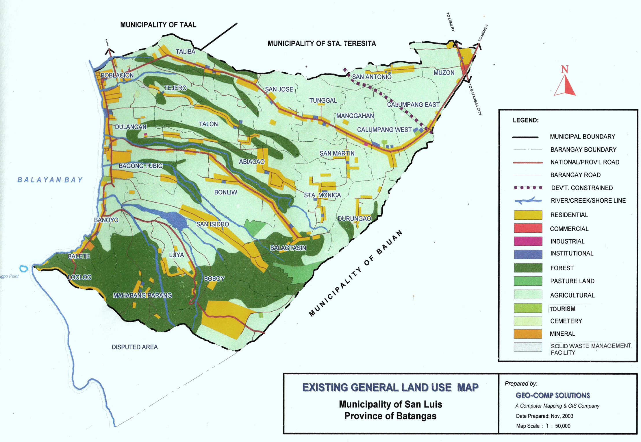 The municipality of San Luis has slightly slope terrain located at the foot of the mountain of Bauan in the south. It is bounded by the municipalities of Taal and Sta. Teresita on the North, and by Alitagtag on the east, while on the west by Balayan Bay. The town is 27 kilometers from the capital of the province and 119 kilometers from Manila.